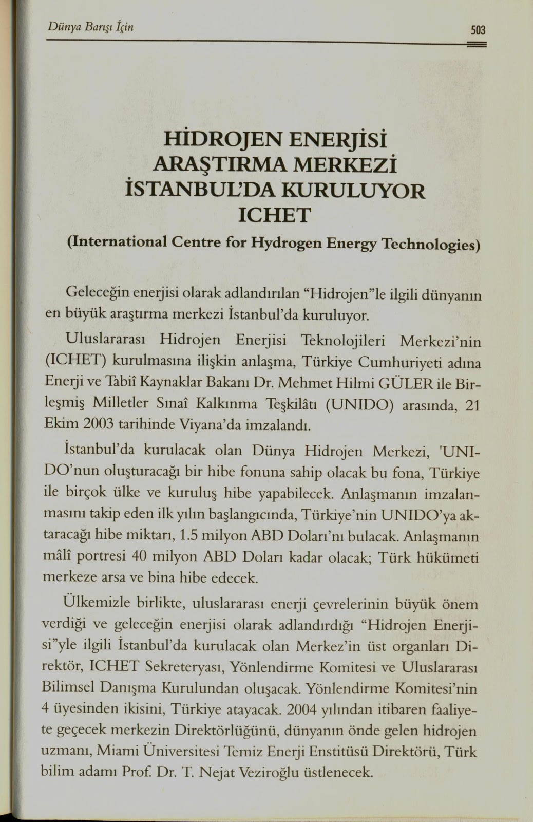 Prof. Dr. T. Nejat Veziroğlu: Şimdi bu merkezin kuruluşuna gelelim. Birleşmiş Milletler beni hidrojen enerjisi üzerine danışman olarak tuttu. Zaman zaman benden rapor istediler. 1988’de yani 17 sene evvel verdiğim bir raporda, dedim ki,